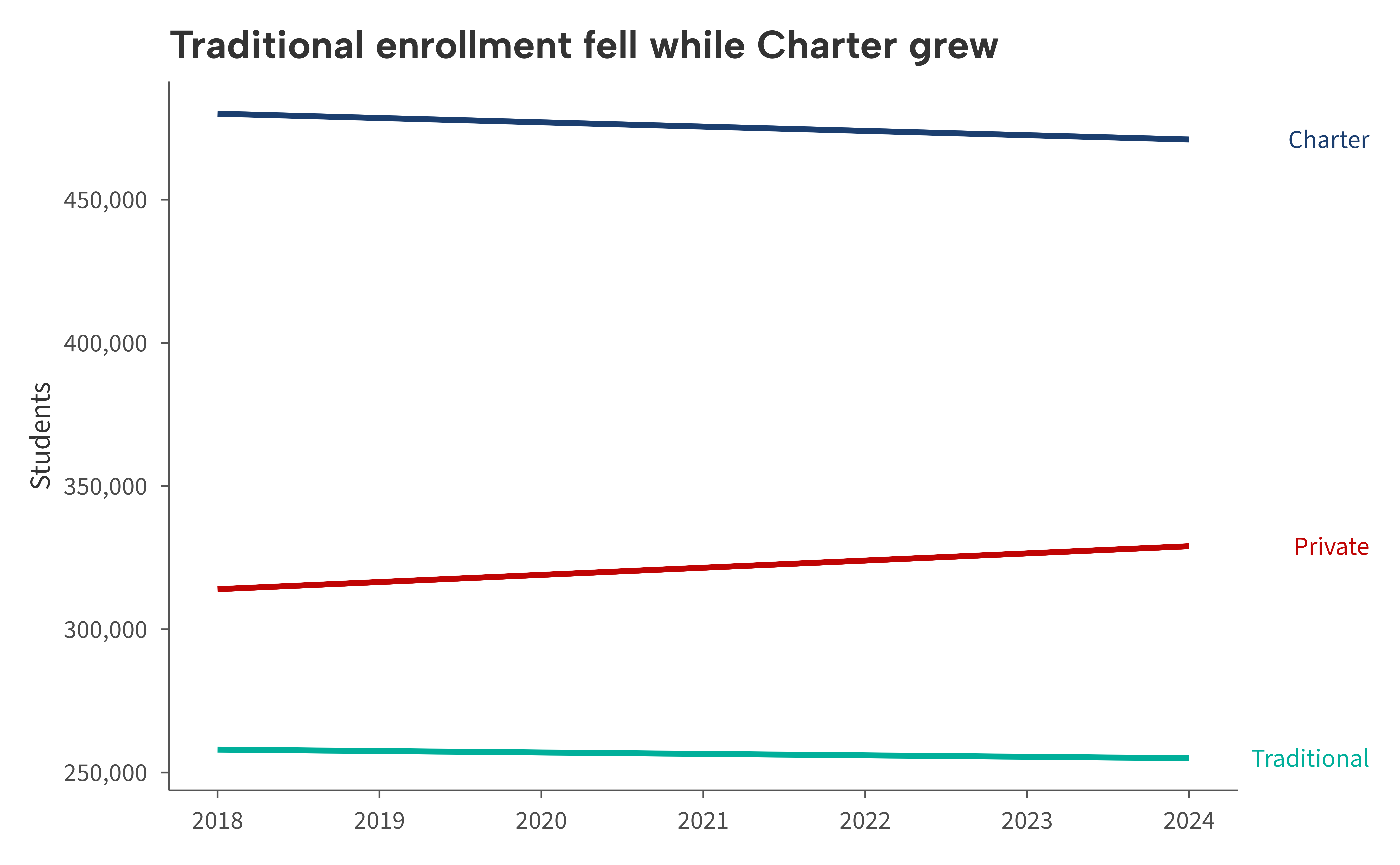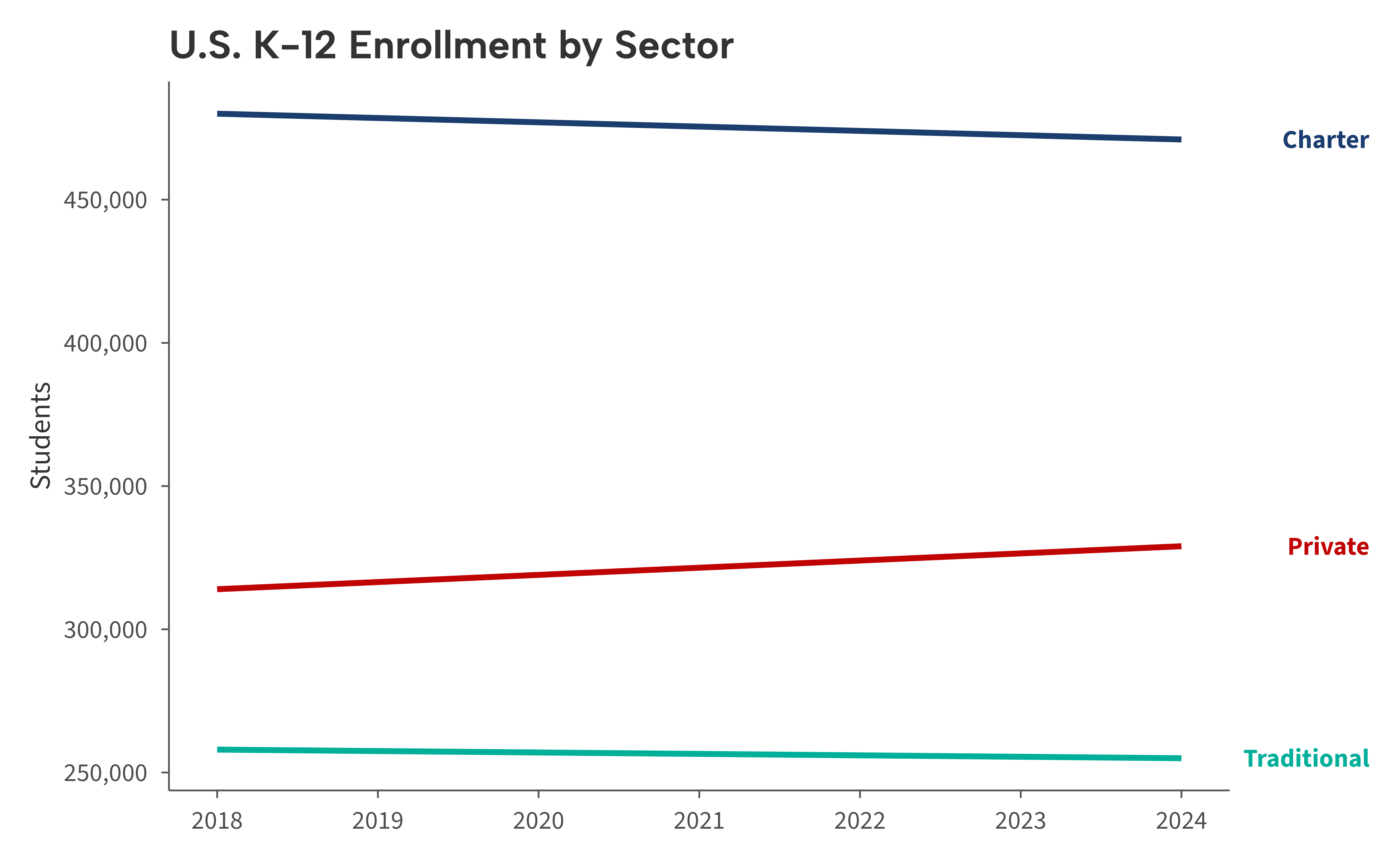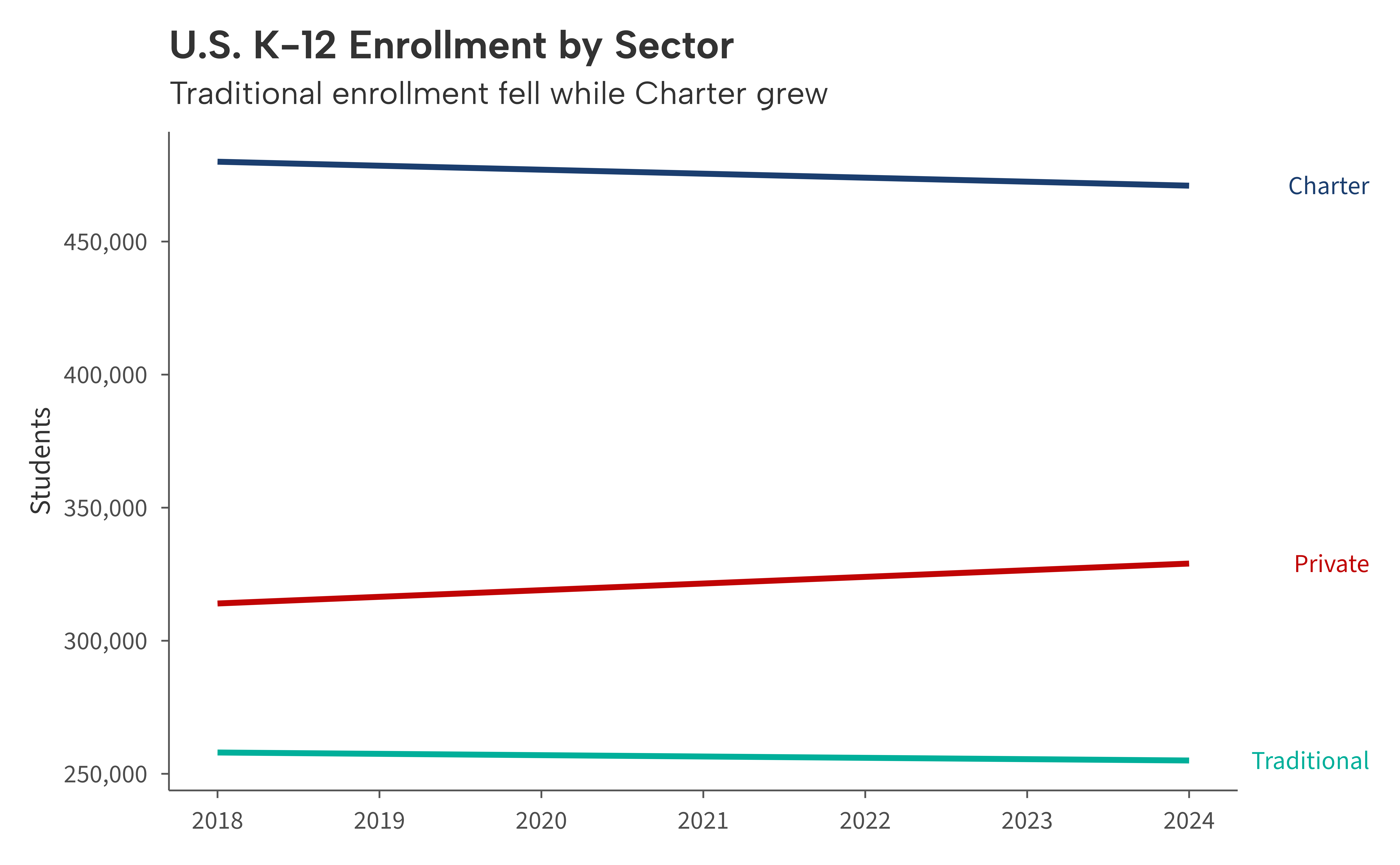 ggplot(enrollment, aes(year, students, color = sector)) +