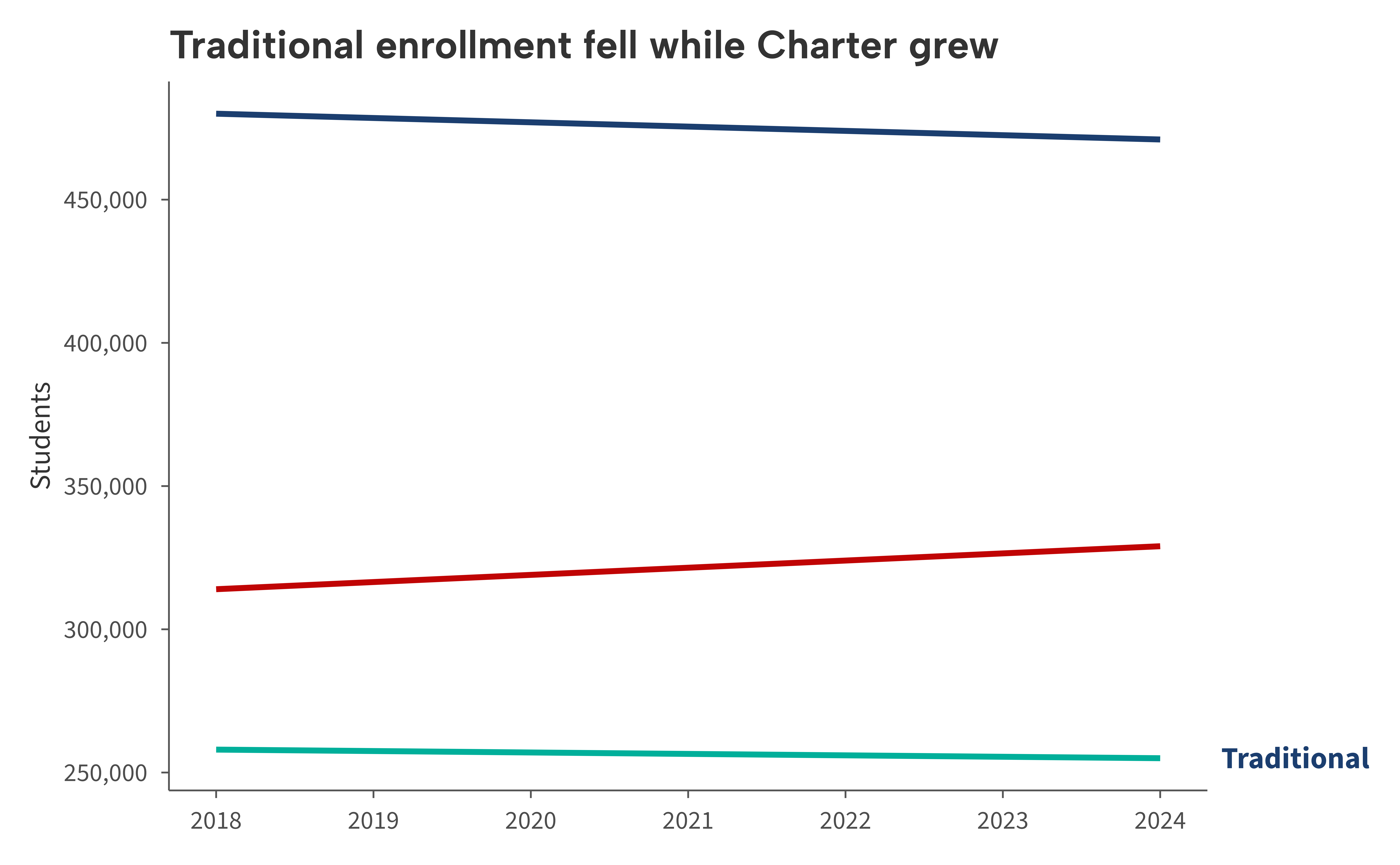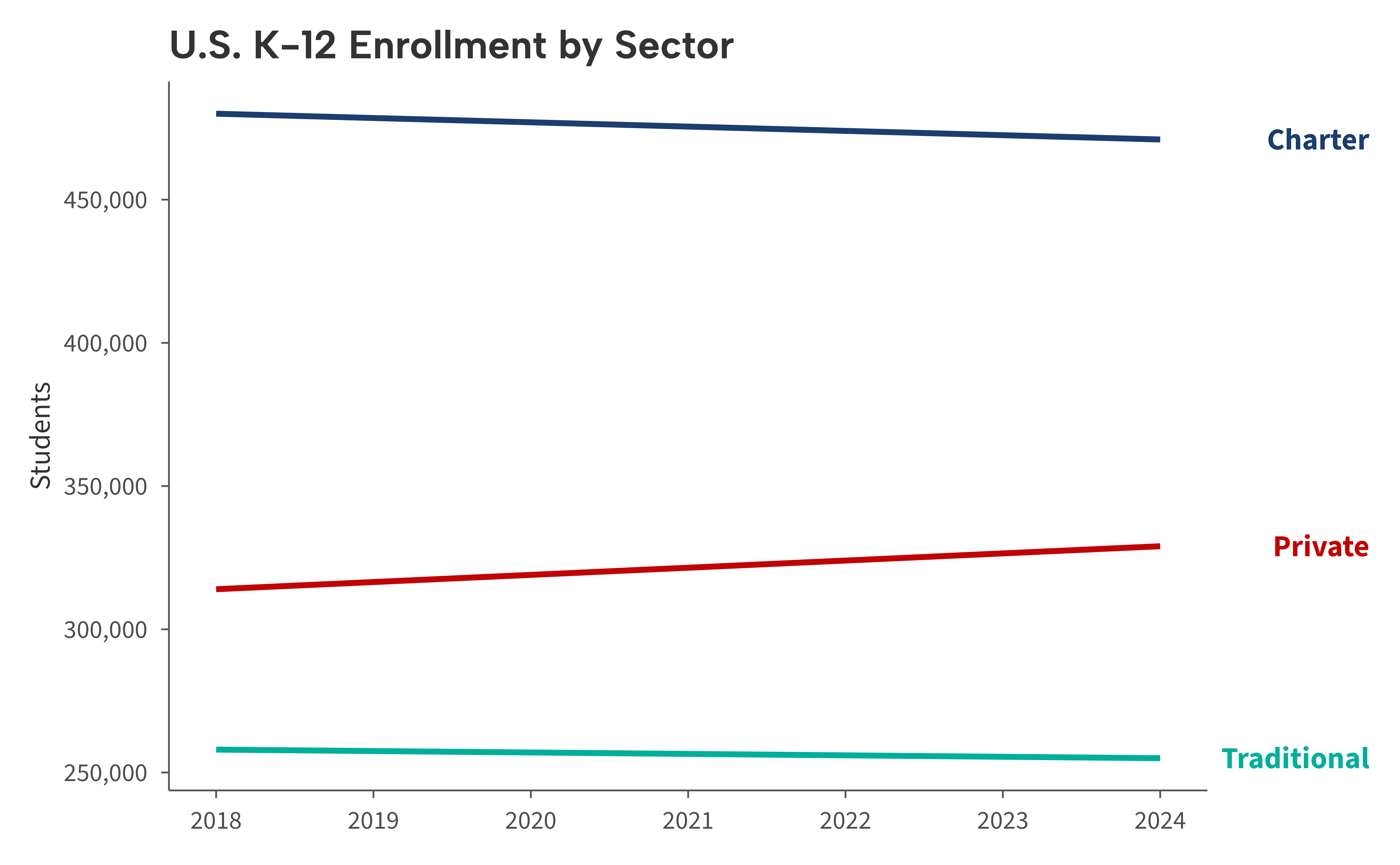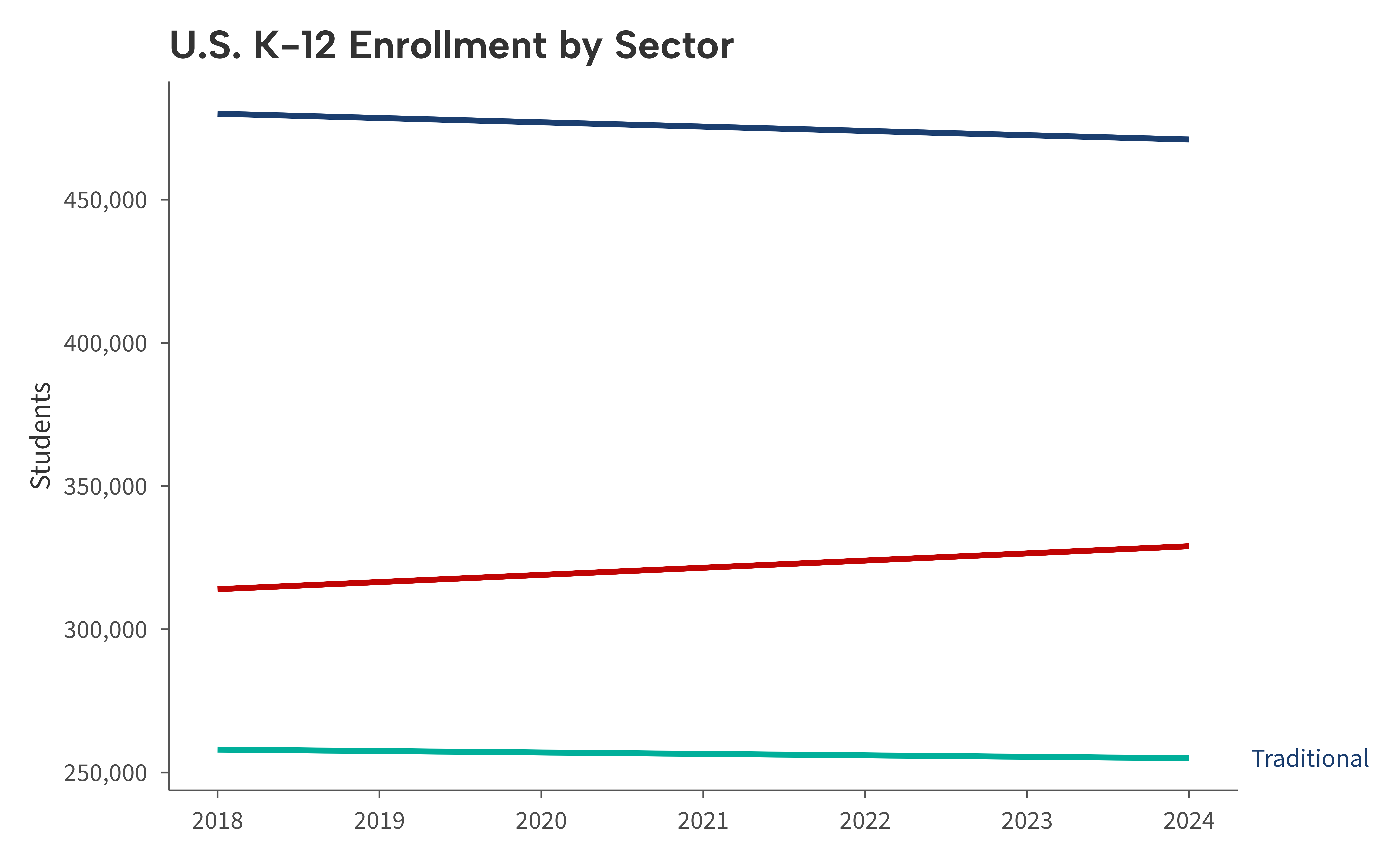 ggplot(enrollment, aes(year, students, color = sector)) +