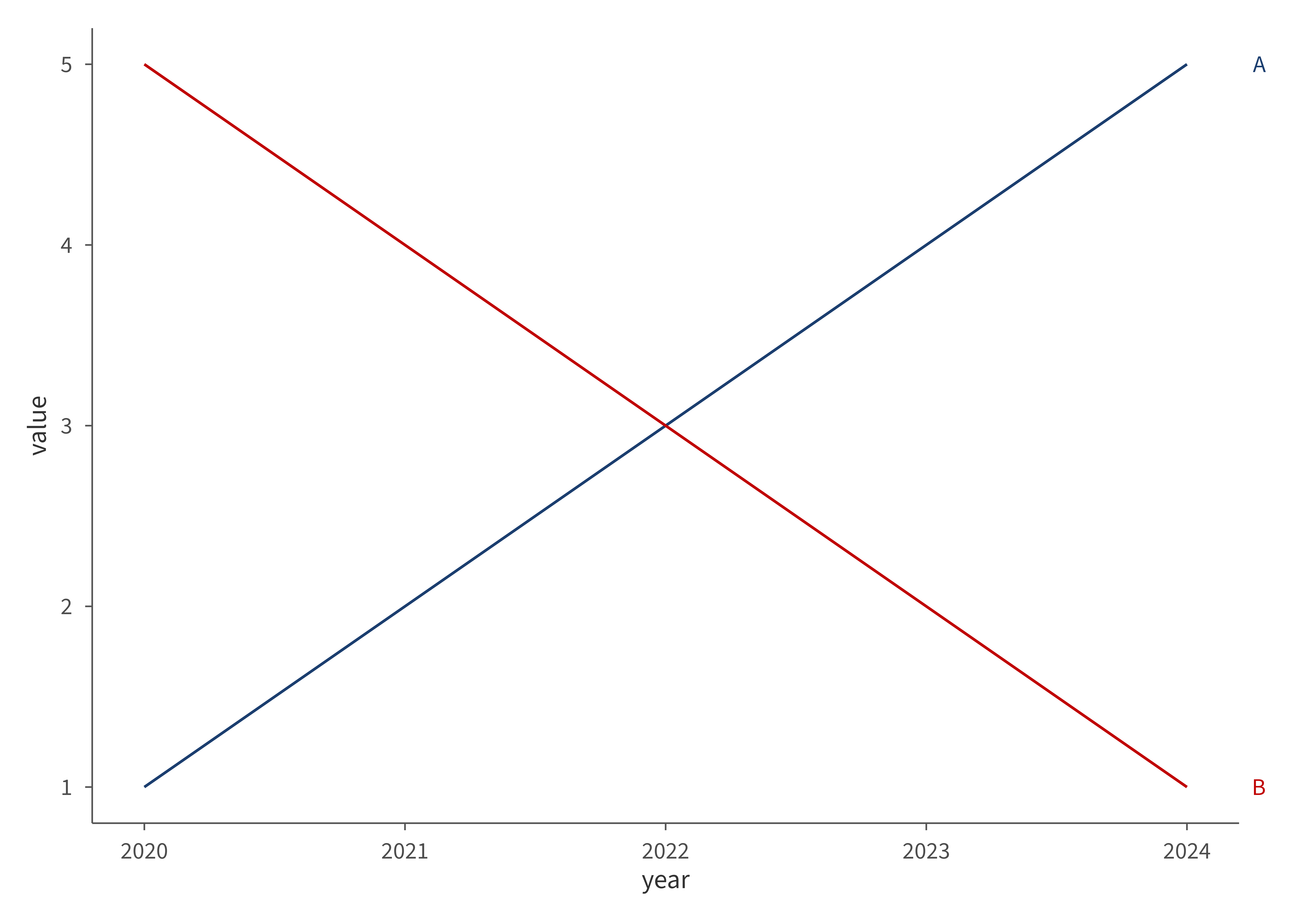 Replaces the legend with group labels placed on a secondary y-axis, aligned with each group's final value. Label colors match the group colors for easy identification.