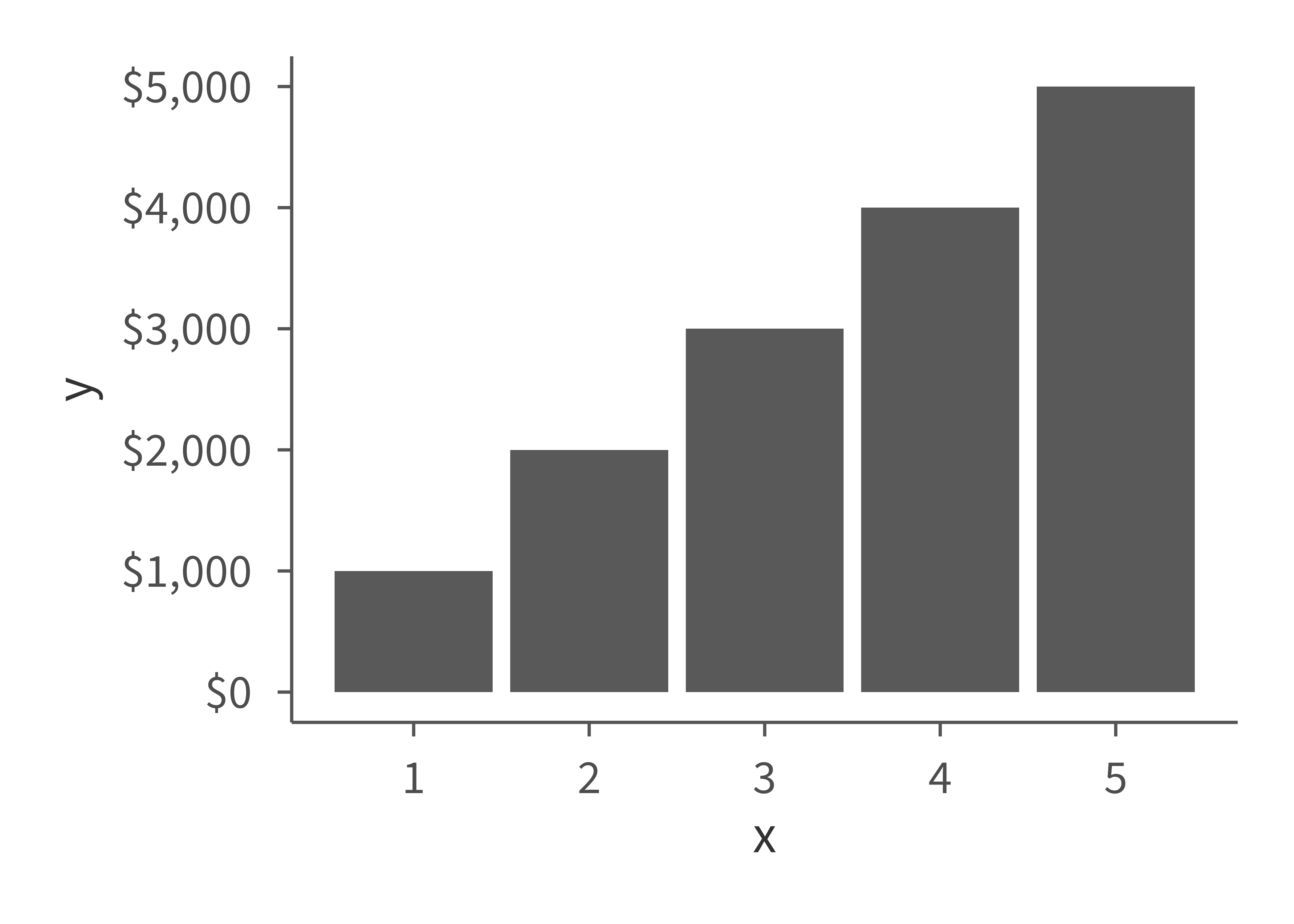 ggplot(data.frame(x = 1:5, y = seq(1000, 5000, 1000)), aes(x, y)) +