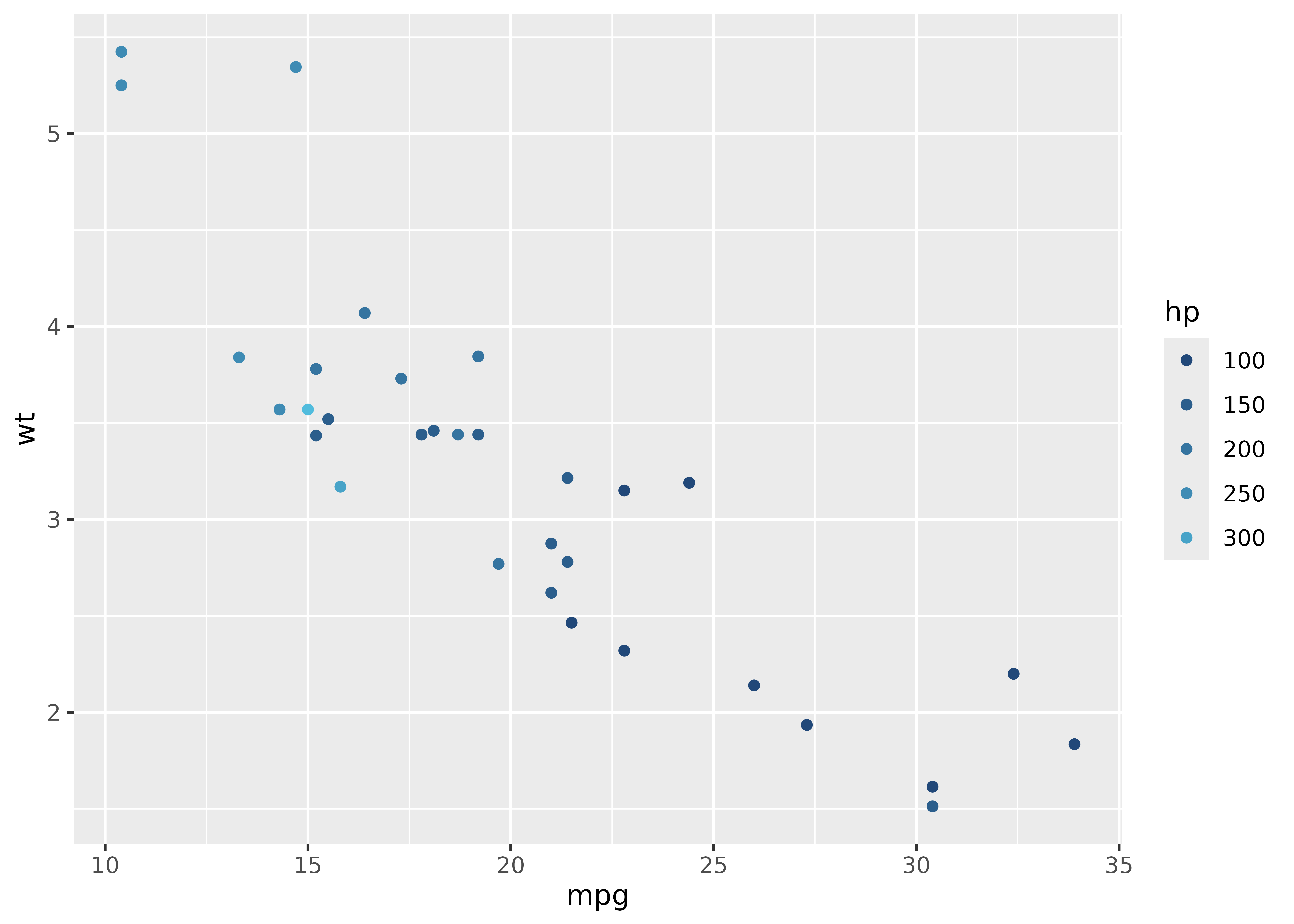 ggplot(mtcars, aes(mpg, wt, color = hp)) +